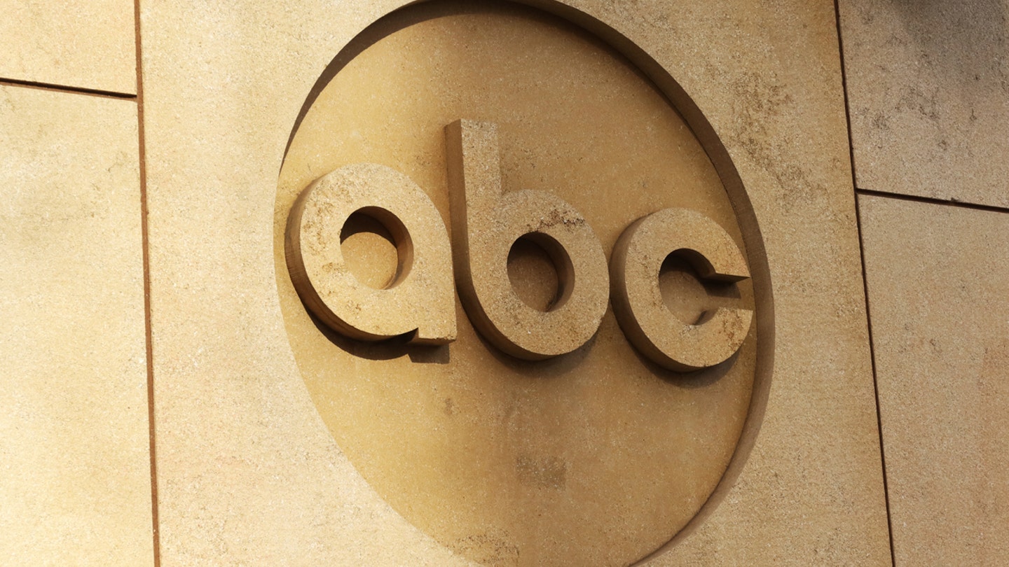 Un logotipo corporativo para la red de televisión ABC se cuelga del lado de su sede corporativa el 17 de abril de 2024 en la ciudad de Nueva York. (Gary Hershorn/Getty Images)