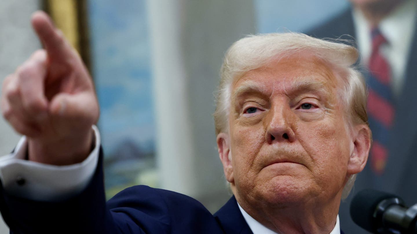 El presidente de los Estados Unidos, Donald Trump, hace un gesto durante una ceremonia de juramentación para Alina Haba como Fiscal Interina de los Estados Unidos para el Distrito de Nueva Jersey, en la Oficina Oval de la Casa Blanca en Washington, DC, 28 de marzo de 2025. (Reuters/Evelyn Hockstein)
