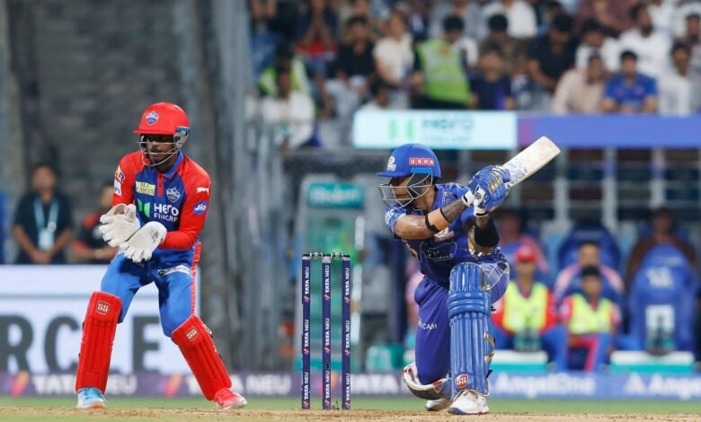 Suryakumar Yadav terminó con una explosión para ayudar a los indios de Mumbai a llegar a 180/5 en 20 overs frente a las capitales de Delhi en el estadio Wankhede en Mumbai el miércoles. Suryakumar entró cuando MI tenía 48/2. Colgó allí cuando MI se redujo a 123/5 en el 17. Naman Dhir se unió a Suryakumar y los dos estamparon su autoridad en los finales.
