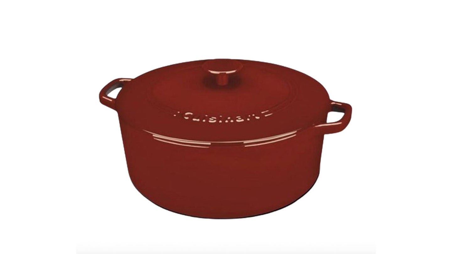 Prueba esto versátil cazuela redonda cubierta de siete cuartos de hierro fundido esmaltado para retención y distribución de calor superior. Este plato seguro para el horno es perfecto para salsas de fuego lento, carnes estofisas o hornear.