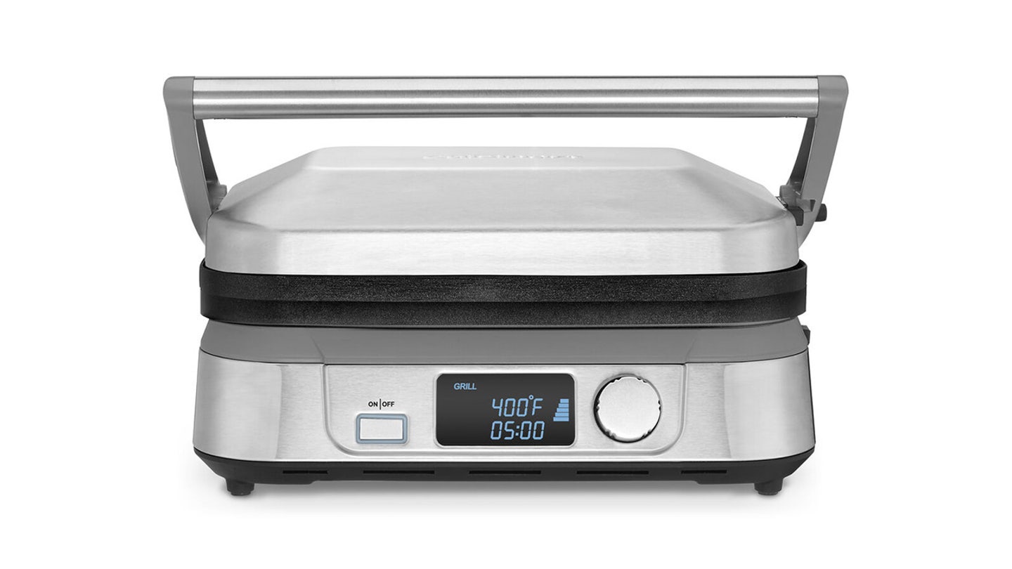 Cuisinart Griddler cinco Cuenta con opciones de cocción cinco en uno, una pantalla LCD, controles digitales fáciles de usar y una función especial. Viene con una cubierta flotante y placas reversibles, lo que le permite usarla como una parrilla o una plancha.