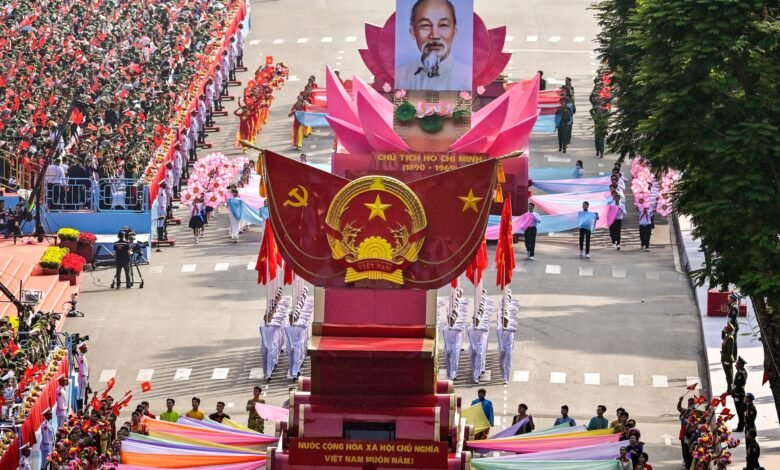 Un flotador en forma de loto que llevaba un retrato de Ho Chi Minh estaba cerca del frente del desfile mientras los aviones de combate y helicópteros que transportaban banderas rojas volaban por encima.