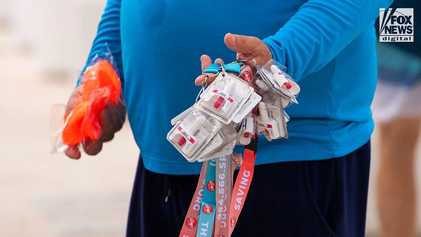 Los trabajadores entregan a Narcan gratis a los rompecabezas de primavera en la playa en Fort Lauderdale, Florida, el 16 de marzo de 2025. (Julia Bonavita/Fox News Digital)