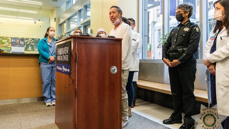 David Easterly se retiró de la Oficina del Sheriff del Condado de King poco después del tiroteo. Sirvió en la agencia durante 25 años. En esta foto, Easterly habla antes de ser dado de alta del hospital en mayo de 2023 (Oficina del Sheriff del Condado de King)