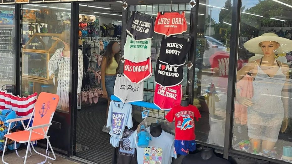 Una tienda de Virginia Beach que muestra ropa etiquetada con un texto sugerente el 14 de agosto de 2025. (Erik Hoffmann/Fox News Digital)