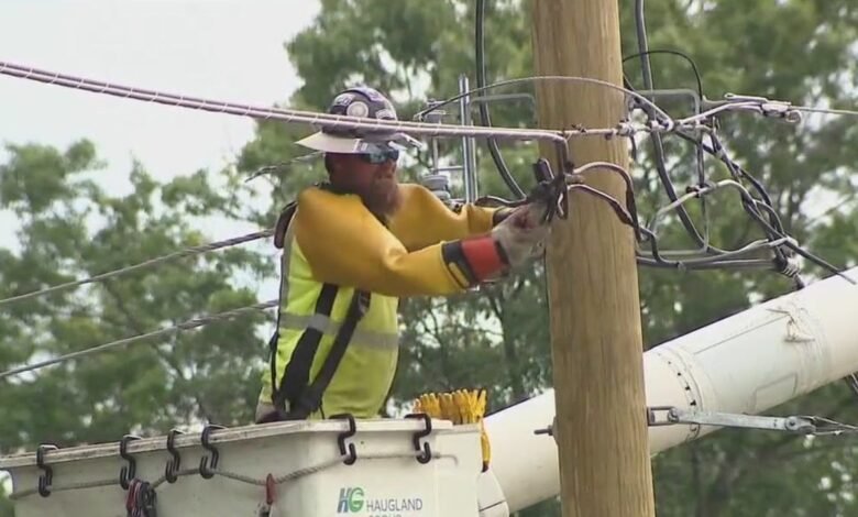 Las compañías eléctricas trabajan sin parar para restaurar la energía después de que las tormentas severas derrotan a los árboles, las líneas eléctricas