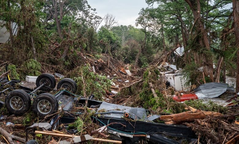 Center Point, Texas – 06 de julio: Los restos de un vecindario se ven a orillas del río Guadalupe el 6 de julio de 2025 en Center Point, Texas. Las fuertes lluvias causaron severas inundaciones a lo largo del río Guadalupe en el centro de Texas, dejando más de 70 p