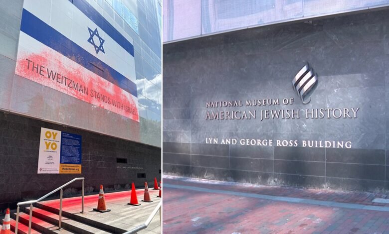 La enorme bandera israelí del lado del Museo de la Historia Judía Americana en Center City fue desfigurada con pintura en aerosol roja el fin de semana pasado, según las autoridades.